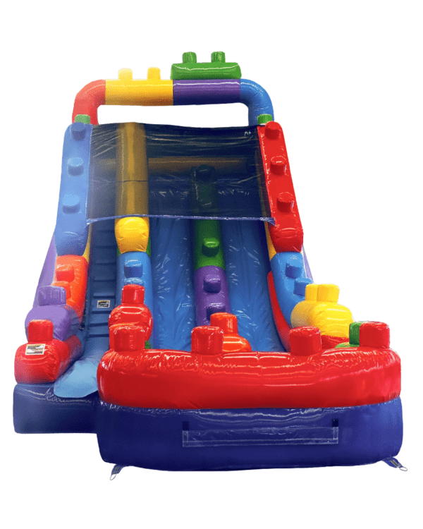 Imagine a towering colorful colossus standing 19 feet tall, a slide that's built for pure adrenaline and endless fun. The Double Lane Mega Block Slide offers a thrilling ride, whether you choose to splash down in soaking wet mode or glide swiftly in dry mode. With two lanes, it doubles the excitement and allows friendly competitions to see who can race down faster. Perfect for summer parties or any fun-filled gathering, this inflatable not only catches the eye but also guarantees hours of joy, laughter, and unforgettable memories.