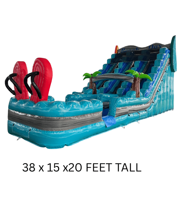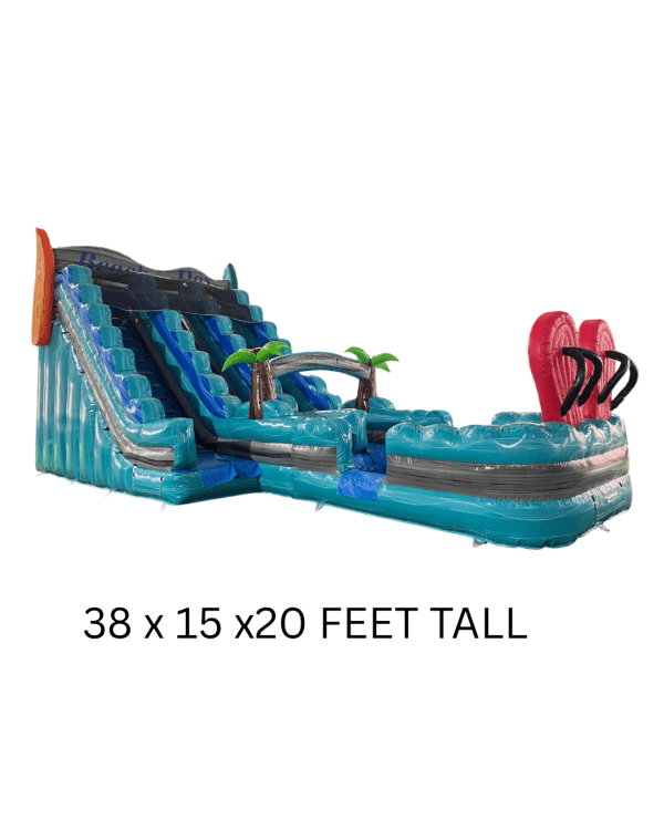 Bring the fun of a sun-soaked seaside afternoon to any backyard or event with this Beach Day Double Lane Wet/Dry Slide. This inflatable features two wide sliding lanes side by side so two people can race down at once, making it perfect for parties, school events, or neighborhood gatherings where competition and laughs are part of the plan. Designed to be used either wet or dry, it includes a splash pool at the bottom and a built-in water hookup for cooling, fast slides in summer, and soft landings — or you can run it dry for safe, fast sliding any time of year. The tall, gently curved slide faces are decorated in bright, beachy colors and patterns that create a cheerful, vacation-like vibe. Safety features include high side walls on each lane to keep riders centered, a roomy climb with secure steps and handholds, and an inflatable barrier at the bottom to slow riders before they exit. Sized to accommodate teens and kids alike, it handles repeated use during a multi-hour rental and is intended for supervised play with clearly posted capacity and age recommendations. Setup requires a level surface, access to a standard power outlet for the blower, and—if used wet—a garden hose hookup; teardown is straightforward for the rental crew. Whether you’re hosting a birthday, company picnic, fundraiser, or summer camp day, this double-lane wet/dry slide delivers fast thrills, head-to-head races, and splash-ready excitement that keeps guests entertained and smiling.